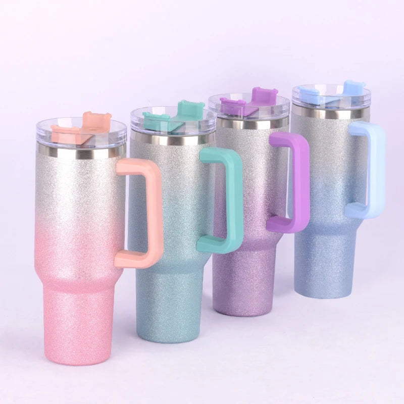 40oz Trendy Rainbow Glitter Gradient Mugs Insulated Tumbler With Handle & Straw Glittery Shimmering Holographic Travel Tumbler